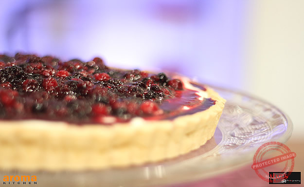 Make up the sweet pastry and use to line and bake bind a fan tin. Allow to cool down completely. For the filling, whip the cream together with the vanilla pod seeds till soft peak. Heat the soaked gelatine leaf and add to the cream along with the melted white chocolate. Fold together immediately, then spoon into the sweet pastry base. Even out and allow to set in the fridge for an hour. Meanwhile prepare the topping by heating together the sugar, frozen fruit, water and gelatine. Bring to the boil, turn off the heat and allow to coo down. When cool enough pour the fruit glaze over the prepared tart and allow to set before serving.