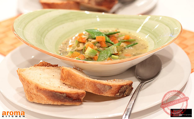 Start this recipe by heating the oil in a deep pan and soften together the leek, celery and garlic for a few minutes. Add in the carrots and herbs and season with salt and pepper. Fry together for a couple of minutes then add in the hot stock, soaked soup mix and bring to the boil. Lower the heat and cook for 30 minutes before adding in the diced pumpkin, zucchini and milk and continue to cook for 5-7 minutes. Turn off the heat, remove the bay leaves and add the kale to the hot soup. Allow to cook for 2 minutes then serve the soup into bowls with the warm crusty bread.