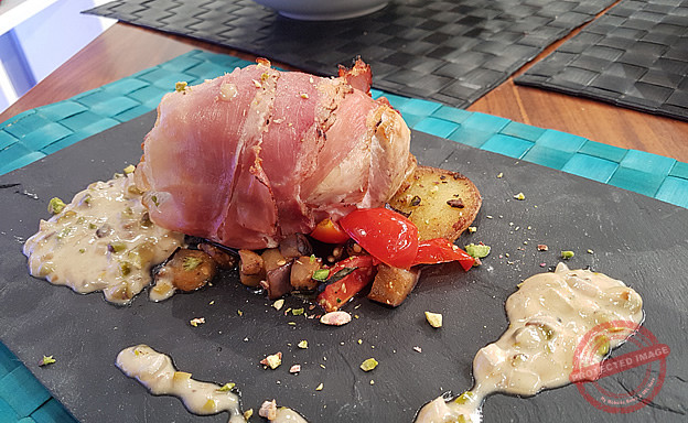 Grill the chicken from both sides, and place in the oven until just cooked through. Slice the bufala and place on the breast wrap with the speck and than grill just before serving on high heat for 2 minutes. Use the same pan to sauté on low heat 1 tsp pistachios and the chopped onion in salted butter until almost browned, than increase the heat add the wine and reduce, top with the cream, the rest of the pistachios and simmer for 2 more minutes. Wash well the potatoes slice and sauté in butter with the garlic until golden. Dice the aubergine season well and sauté in in olive oil until softened, add the tomatoes cut in half toss well, add the roughly chopped basil and remove from heat. Serve immediately.
