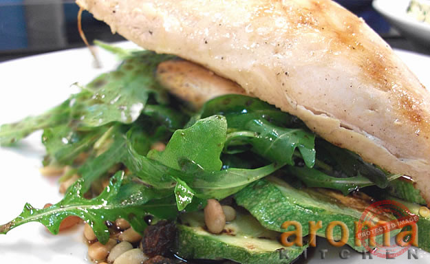 Heat 1 tablespoon of olive oil in a large griddle pan, and cook the sliced zucchini on both sides. Remove them from the pan, and add the chicken fillets. Season with pepper and salt and also cook them on both sides till golden brown. Next, place the rucola leaves, sultanas, pine nuts, chopped garlic, balsamic vinegar, 2 tablespoons of olive oil, lemon juice and zest in a bowl. Season well with salt and pepper, and mix well till you have a nice glossy salad. Arrange the cooked zucchini slices onto 2 serving plates. Place the ruccola salad on top, scattering some of the pine nuts, sultanas and juices around the plate. Finally, place 2 chicken fillets on top of each salad and serve.